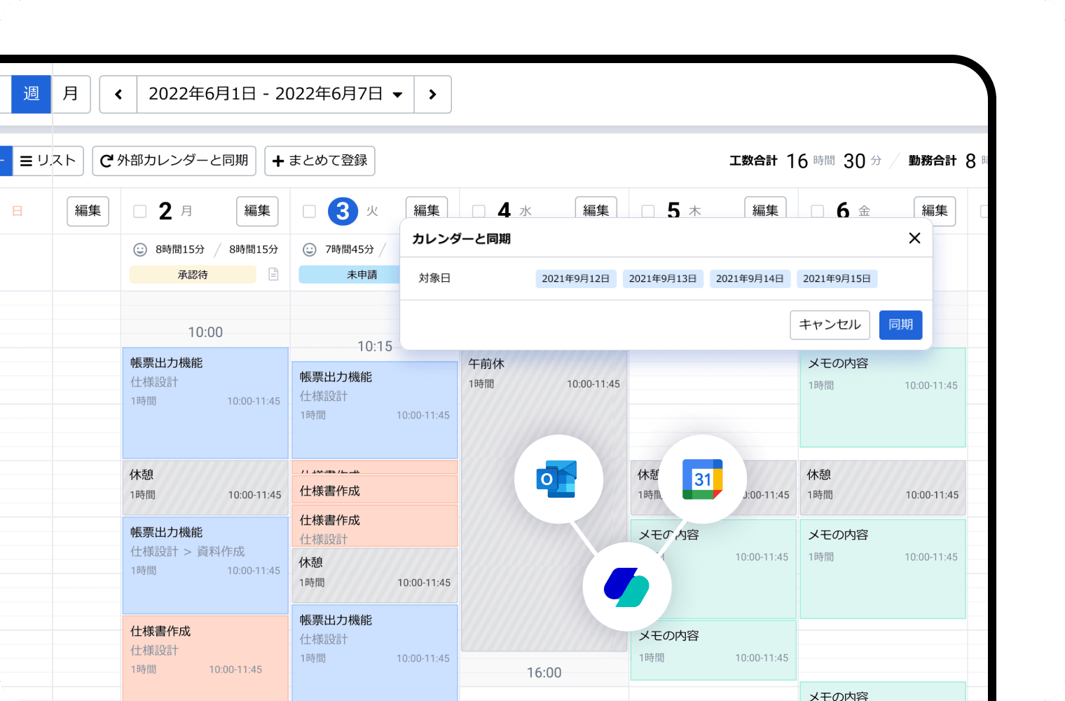 勤怠システムやカレンダーと連携、承認機能を活用することで、客観的な記録に基づいた工数管理を実現。記憶頼りの曖昧な入力をなくし、データの正当性を担保します。A