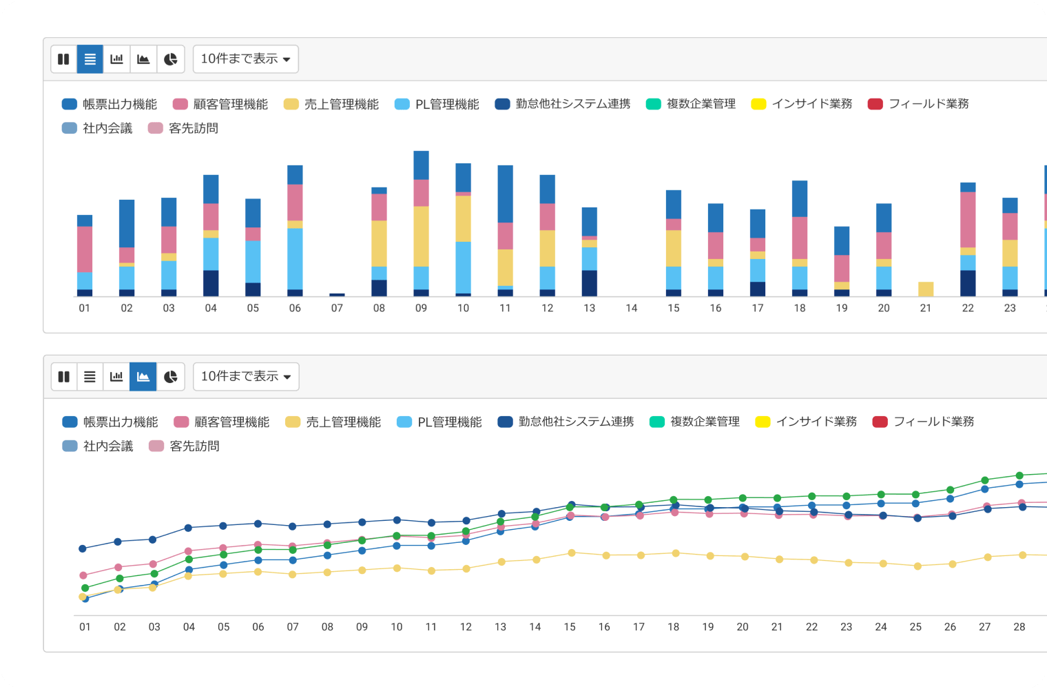 プロジェクト別・個人別など、多彩な切り口でのレポートをリアルタイムに自動作成。Excelへの出力や、柔軟な絞り込みも可能で、あらゆる分析ニーズに応えます。AAAAAAAAA
