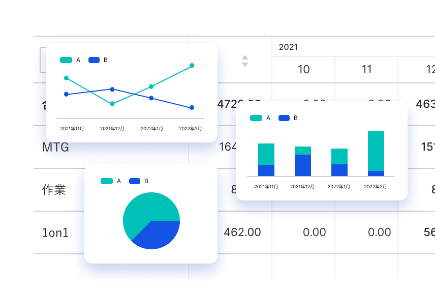 プロジェクト別・個人別など、多彩な切り口でのレポートをリアルタイムに自動作成。Excelへの出力や、柔軟な絞り込みも可能で、あらゆる分析ニーズに応えます。AAAAAAAAA