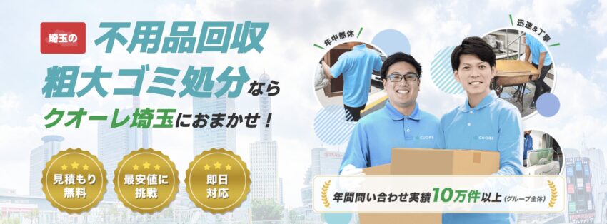| 対応エリア | 埼玉県、東京都、神奈川県、千葉県、群馬県、栃木県、茨城県 ※不用品回収サービスの場合 |