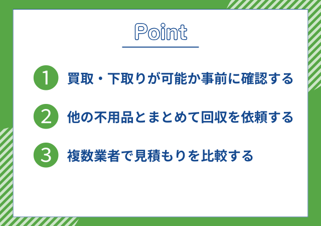 また、買い替えを予定している場合は、販売店やメーカーが下取りサービスを行っていないか確認してみましょう。下取り価格が付けば、処分費用が実質的に相殺され、コスト削減につながります。処分を決める前に、一度査定を受けてみることが大切です。