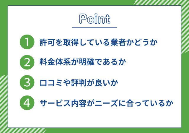 トラブルを避け、安心して任せるためにも、以下の4つのポイントを確認しておきましょう。