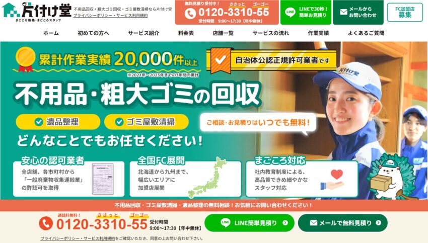 | 料金プラン例 | ・SSプラン(押し入れや倉庫などの片付けにおすすめ):8,800円 ・Sプラン(1R〜1K程度の部屋の片付けにおすすめ):12,800円 ・Mプラン(1K〜1DK程度の部屋の片付けにおすすめ):29,800円 ・Lプラン(1DK〜1LDK程度の部屋の片付けにおすすめ):49,800円 ・LLプラン(1LDK〜2LDK程度の部屋の片付けにおすすめ):98,000円 ・載せ放題プラン(オフィスやゴミ屋敷の片付けにおすすめ):要相談 |