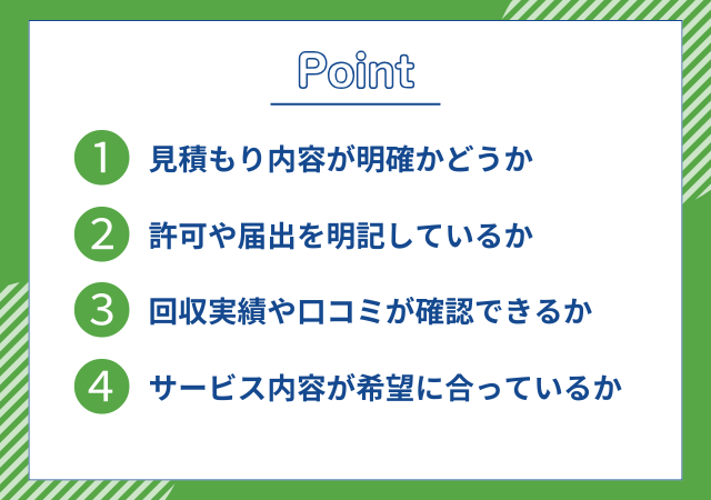 ここでは、安心して利用できる業者を見極めるために、チェックしておきたい4つのポイントをご紹介します。