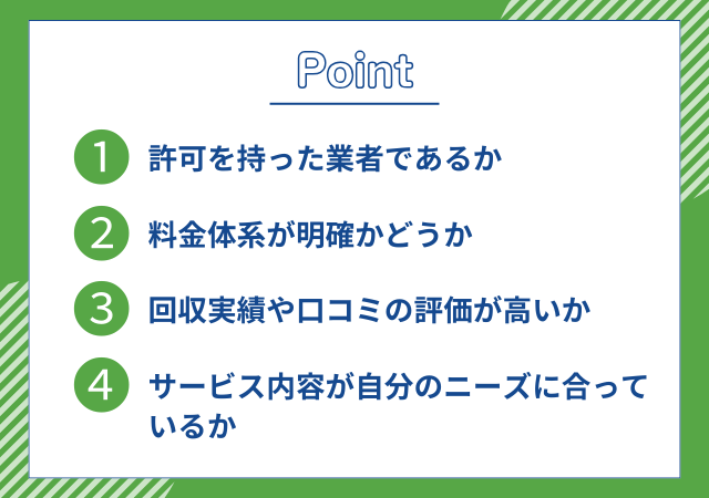 不用品回収業者とのトラブルを避け、納得のいくサービスを受けるためには、以下の4つのポイントを意識して選ぶことが大切です。